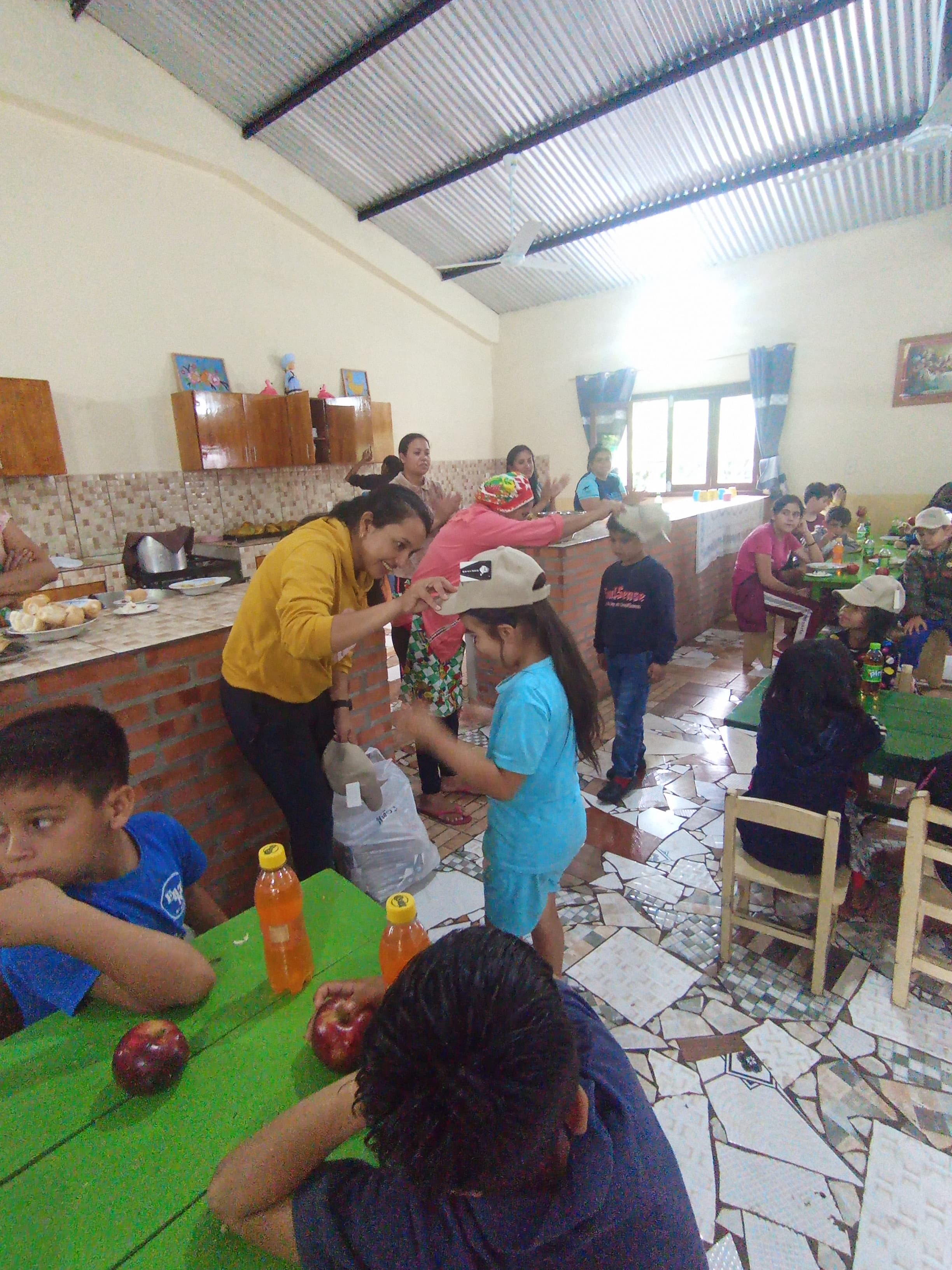 Der feierliche Anlass lud zu viel Lärm, Gelächter und Gesprächen im Speisesaal ein. Nach dem Mittagessen wurden die Weihnachtsgeschenke überreicht, welche von Katrin und ihren Spendern aus Deutschland, sowie von Herrn Manuel Acosta finanziert wurden. Als Geschenk überlegten wir, ihnen Kappis zu schenken. Die Auswahl geschah aufgrund des Gedanken, den Kindern Schutz vor der brennenden Sonne von bis zu 42 °C zu bieten. Somit erhielt jedes angemeldete Kind ein Kappi mit dem Logo des Hogars María de la Pasión. Unser großer Dank gilt Katrin mit ihren Spendern und Herrn Manuel Acosta!